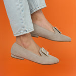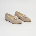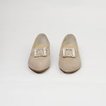 Baleta en cuero carnaza color arena, herraje cuadrado en piedras, suela tr